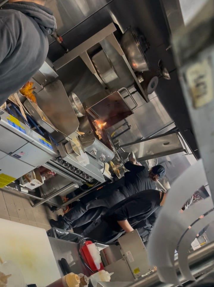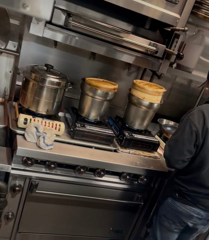 They brought me back to the kitchen. Sure enough, the stations were lined with individual induction burners on which pots and steamers cooked dumplings and a flames rose from wood in the grill. A remarkable feat of jerry-rigging a professional kitchen.
