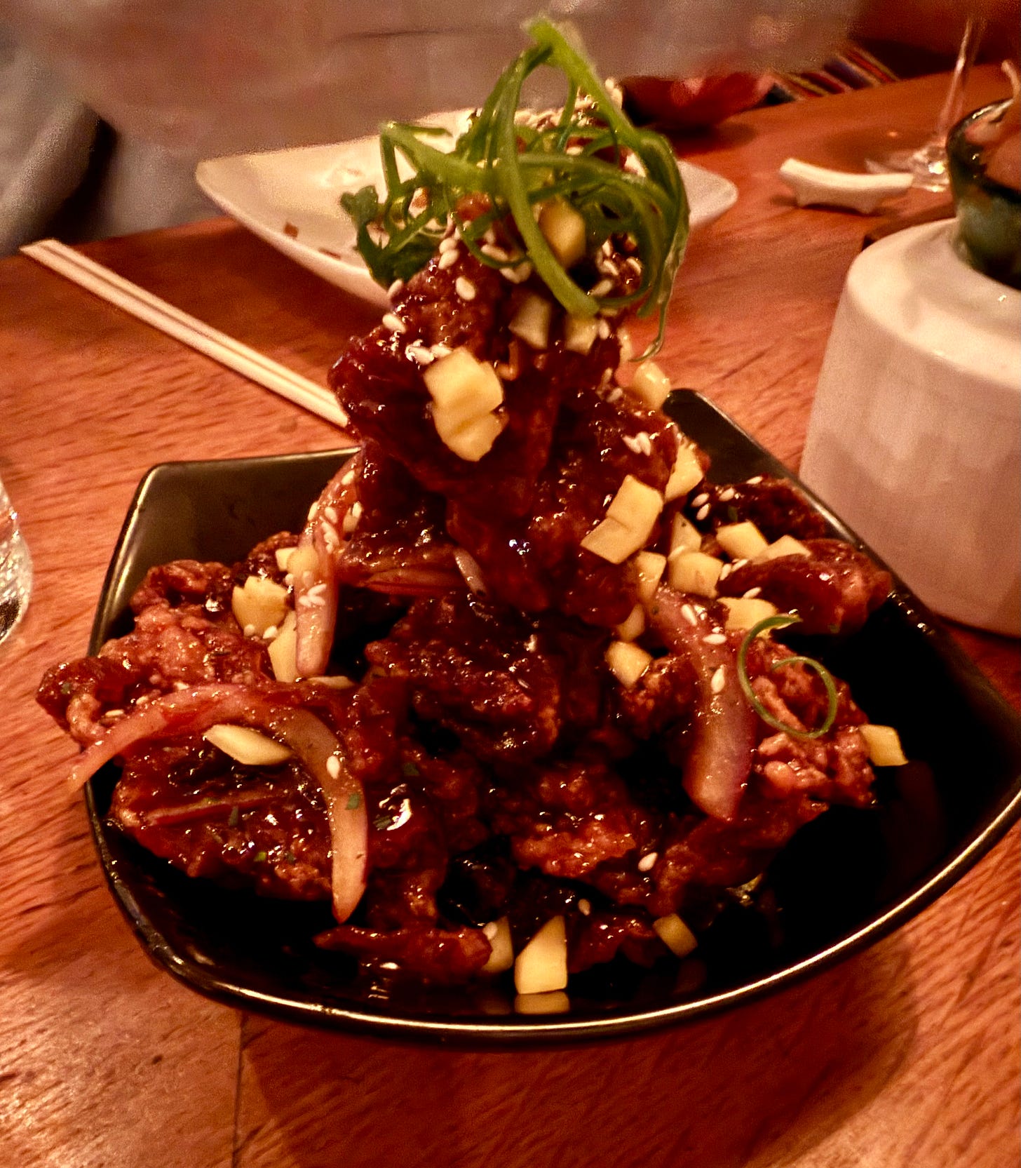 The food here is like Chinese food as imagined by a Jewish New Yorker—because that’s what it is. Created by Ed Schoenfeld in 2011, who died from cancer the year of the fire, the restaurant serves a kind of a “best of” of from the Chinese-American repertoire—crispy beef, for instance—along with some weird creations such as the pastrami egg roll (actually quite good).