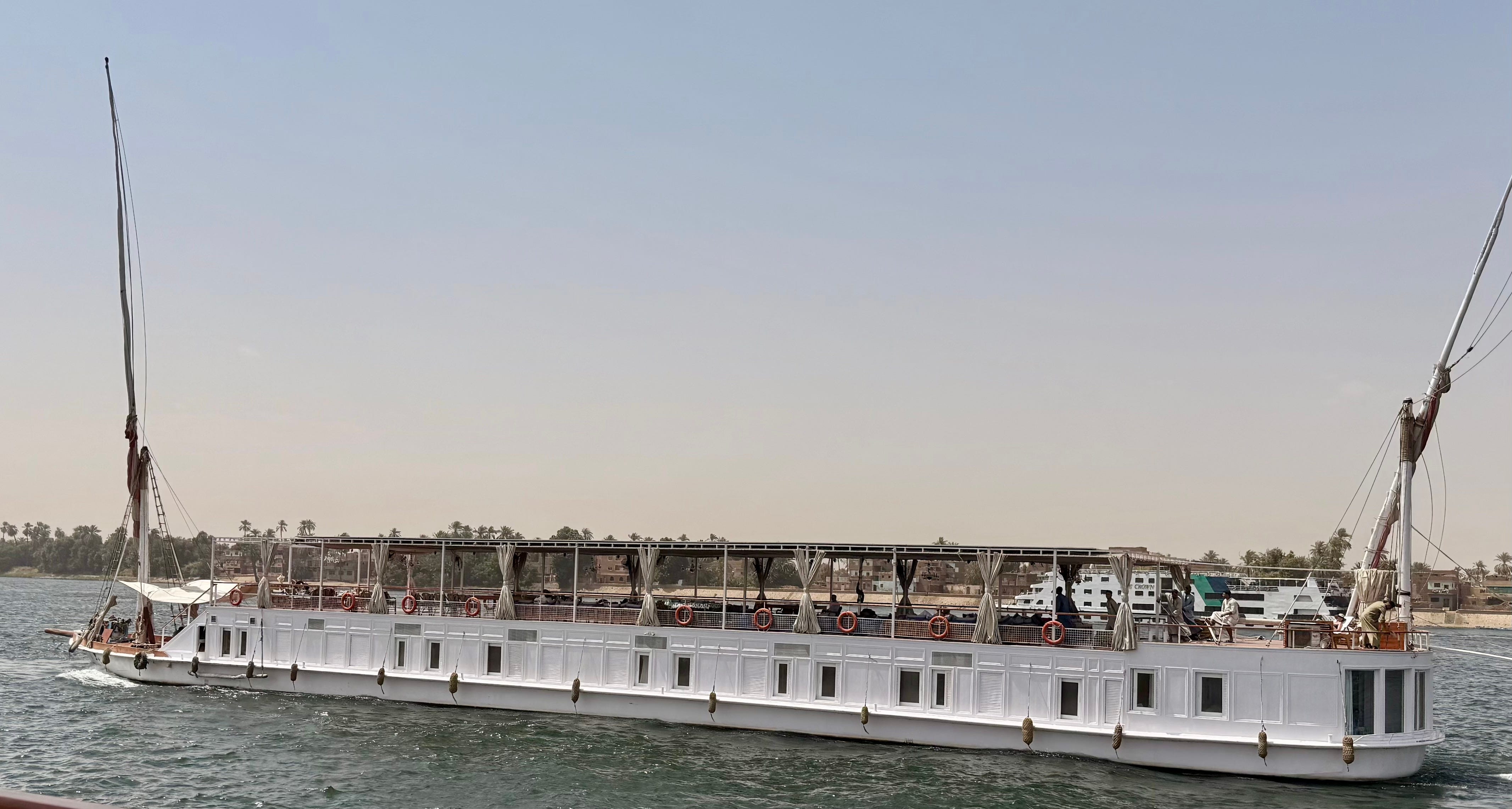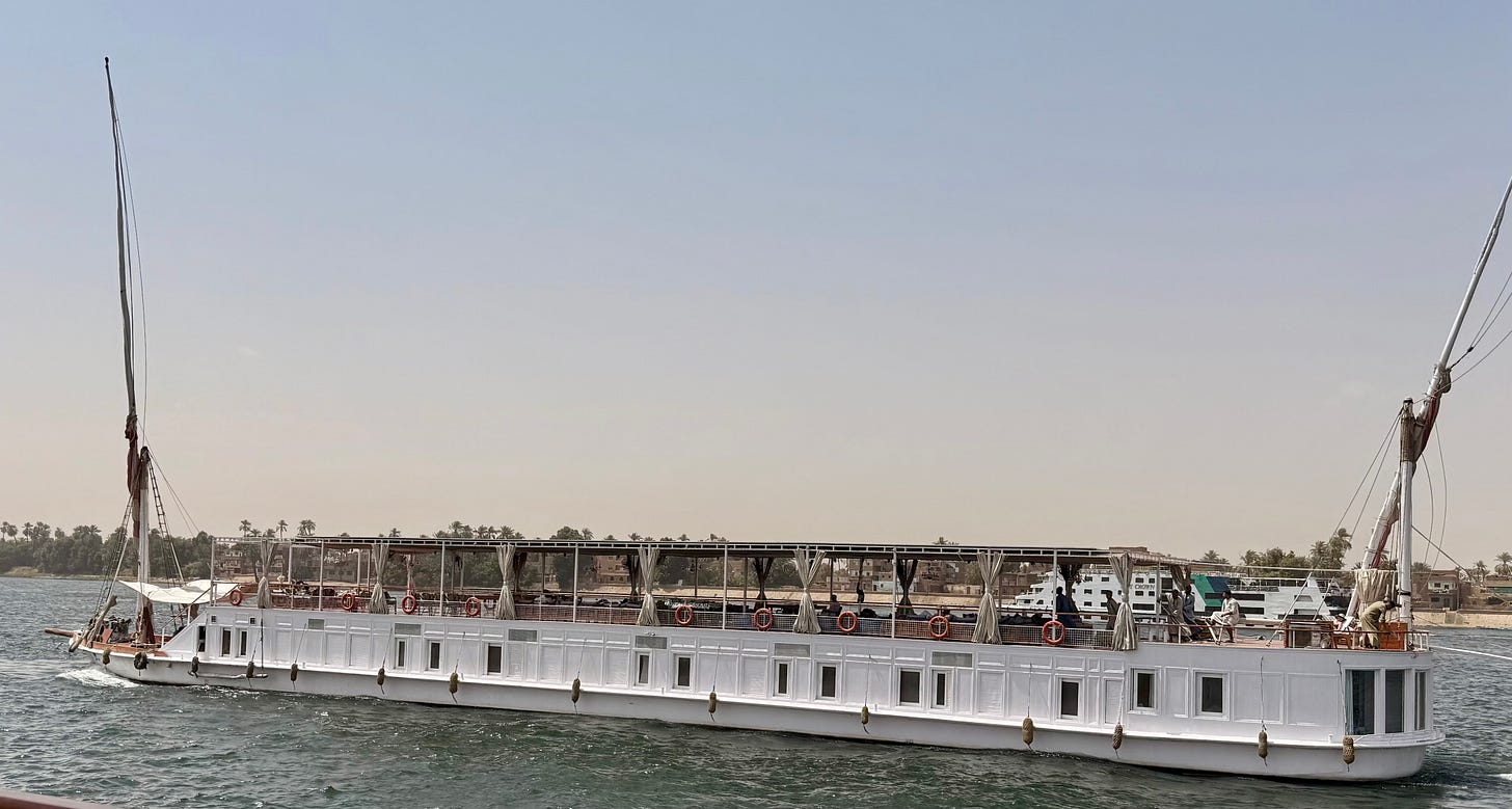 A couple of years ago, before my 60th birthday, my wife Ann searched for a trip that would be commensurate with the occasion. Ann is an extraordinary scraper of travel info and ideas and deals we can afford. She discovered a company called Nour el Nil, which takes passengers on the Nile from Luxor, one of the oldest cities in Egypt (originally Thebes), 140 miles south to Aswan. Passengers travel on a Dahabiya, a traditional, wooden Egyptian sailing boat, 50 meters long with ten rooms carrying up to 20 passengers. Alas, I was born in the early phase of Leo, which means, of course, that the Nile at the end of July is about 120 degrees F. in the daytime. Not doable.